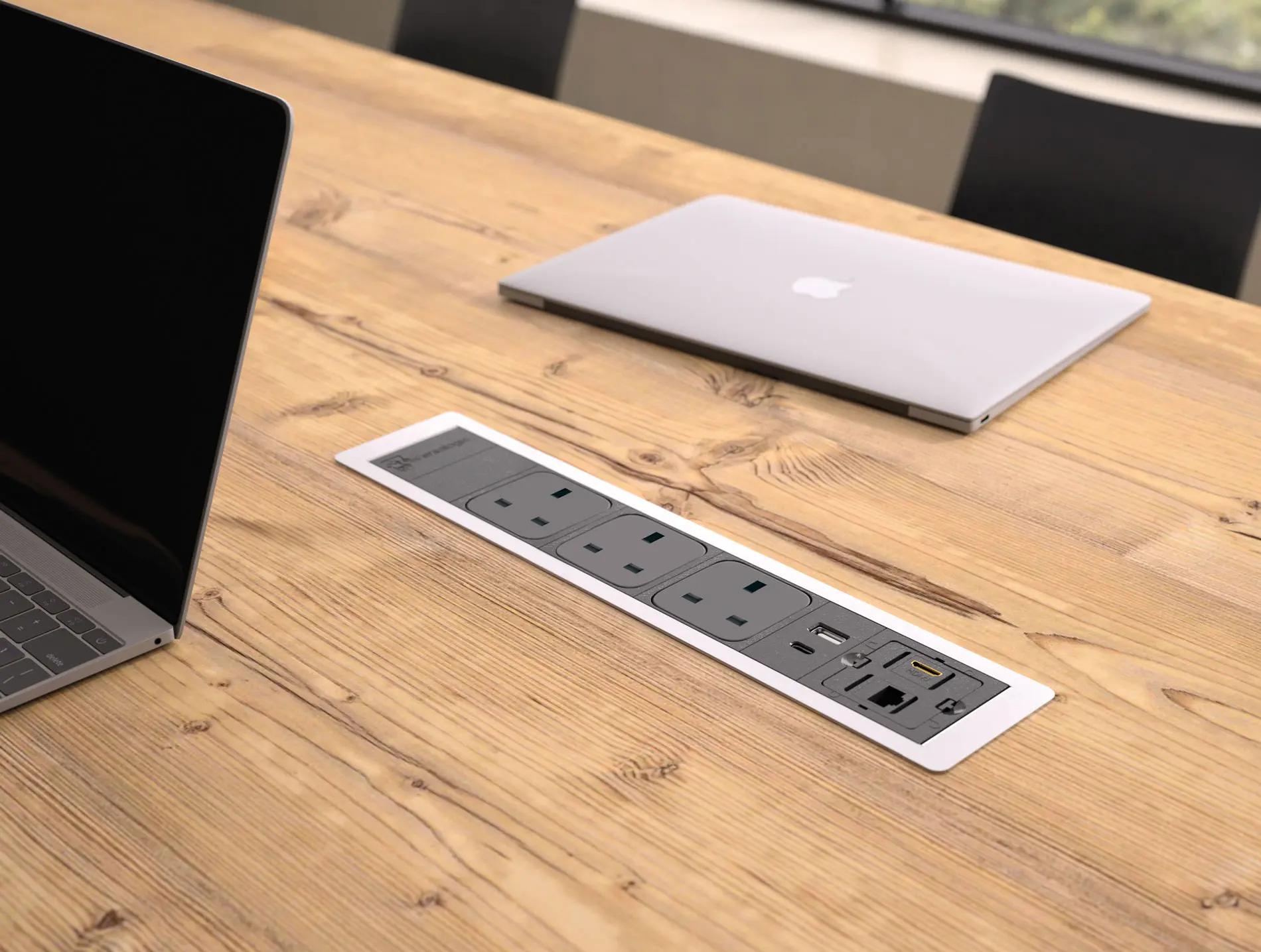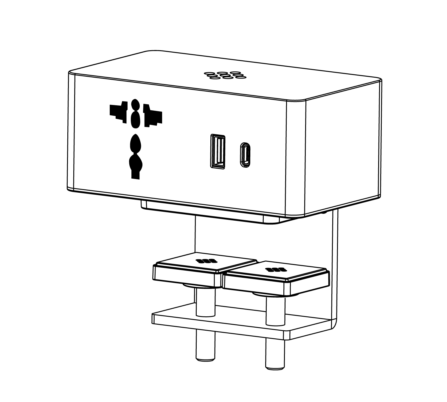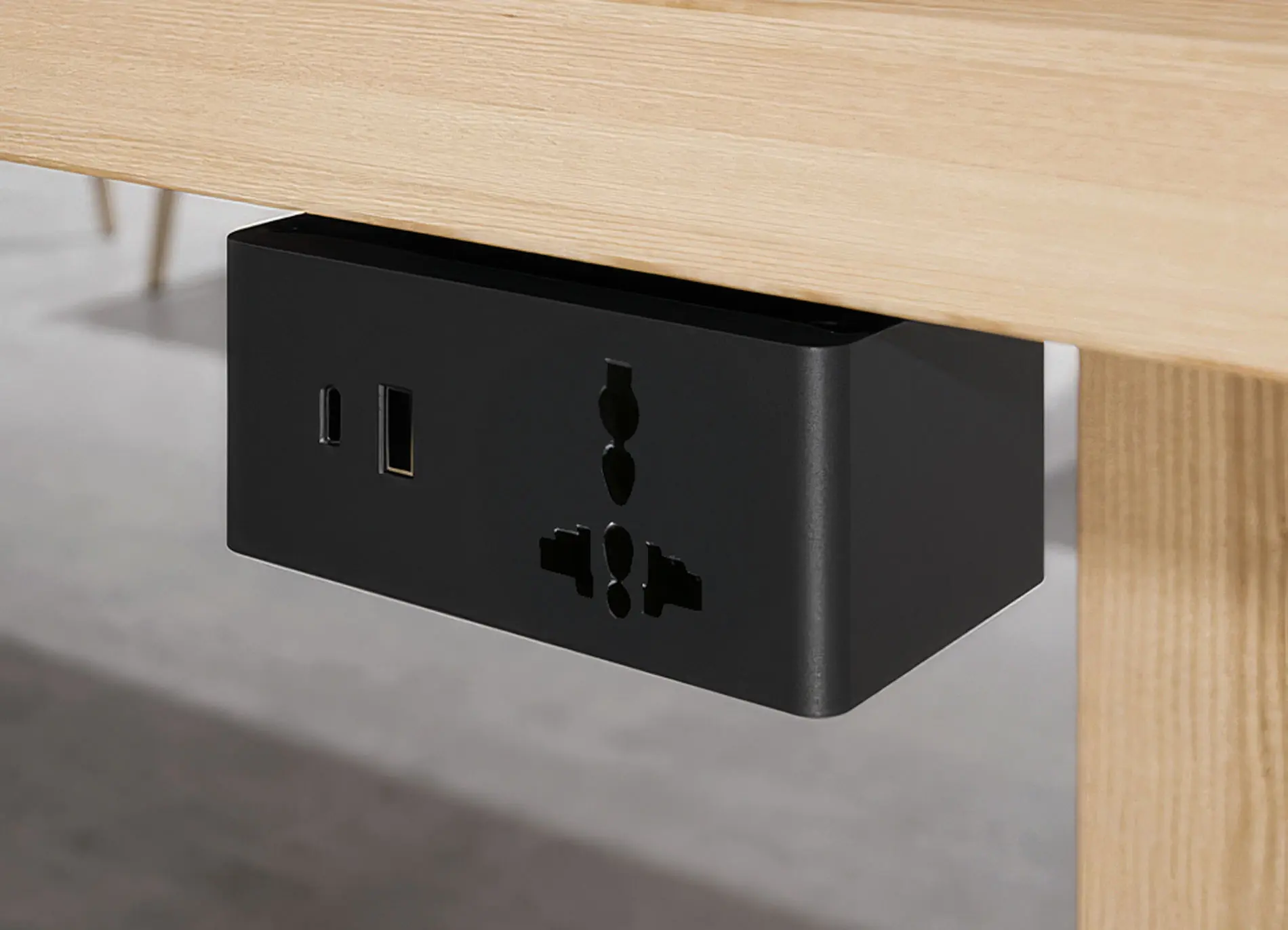 Power block equipped with 3 power outlets + 1 USB-A 5V port + 1 USB-C 5V port + 1 cable entry port.