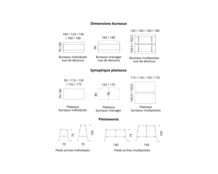 Piétements permettant la fixation d’accessoires ou d’options (caissons, panneaux écrans, support accessoires, extensions). - Électrification
