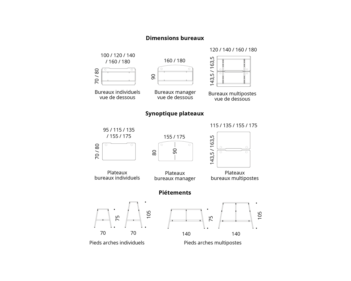 En configuration multiposte face à face, un espacement de 3,5 cm entre les plateaux permet le positionnement d’un écran séparateur ou le passage des câbles. - Piétements