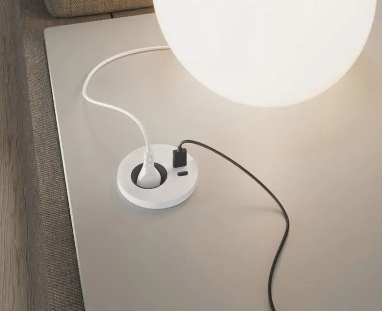 Se fixent sur les plateaux des plans de travail à la place des obturateurs passe-câbles standards ou via les perçages pré-débouchants Ø 80 mm (selon versions).